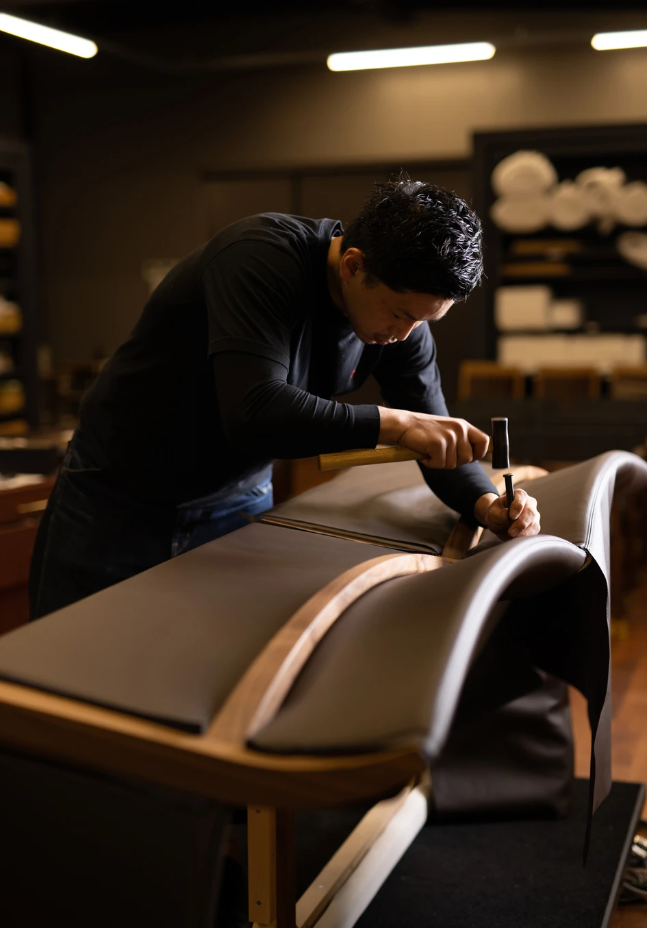 Imbuing this temperament into each design starts with providing a peaceful, natural working environment for craftsmen at the Itoshima Seaside Factory by the Genkai Sea, surrounded by mountains and pine forests. Ritzwell believes that enhancing an initial human bond with the furniture will enhance the connection with its user.