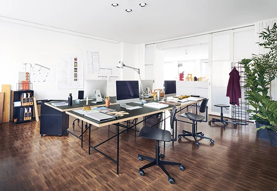 Richard Lampert has been producing furniture and furnishings since 1993. Talking to Richard Lampert, his passion for furniture – timeless designs without frills, but with that certain something – quickly becomes evident. The members of his team – complemented by the designer Alexander Seifried – are important sparring partners for him. A design must convince – with a clear and possibly unconventional idea. Only then does he ask himself whether the design is strong enough to be produced in high quality and in large numbers. “The product must have a soul,” says Lampert. One of the absolute classics in the collection is the original Egon Eiermann table from 1953 with inclined diagonals in a level of welded cross-struts. It is exclusively manufactured by Richard Lampert and in terms of its details is – “Eiermann-like” – in a class of its own. As a complement to the original, there is a double workstation, a high or standing desk, as well as office chairs with the same design consistency. All of this continues to enthuse users today – with shape and structure reduced to the essentials. Like almost all Richard Lampert products, these furniture items can be used everywhere – from the office to private homes. “Luckily, architects and interior designers see the particularity of the collection and use it as an alternative to well-known designer furniture.” This gives Lampert the confidence that small companies operating in a niche have a chance of survival.