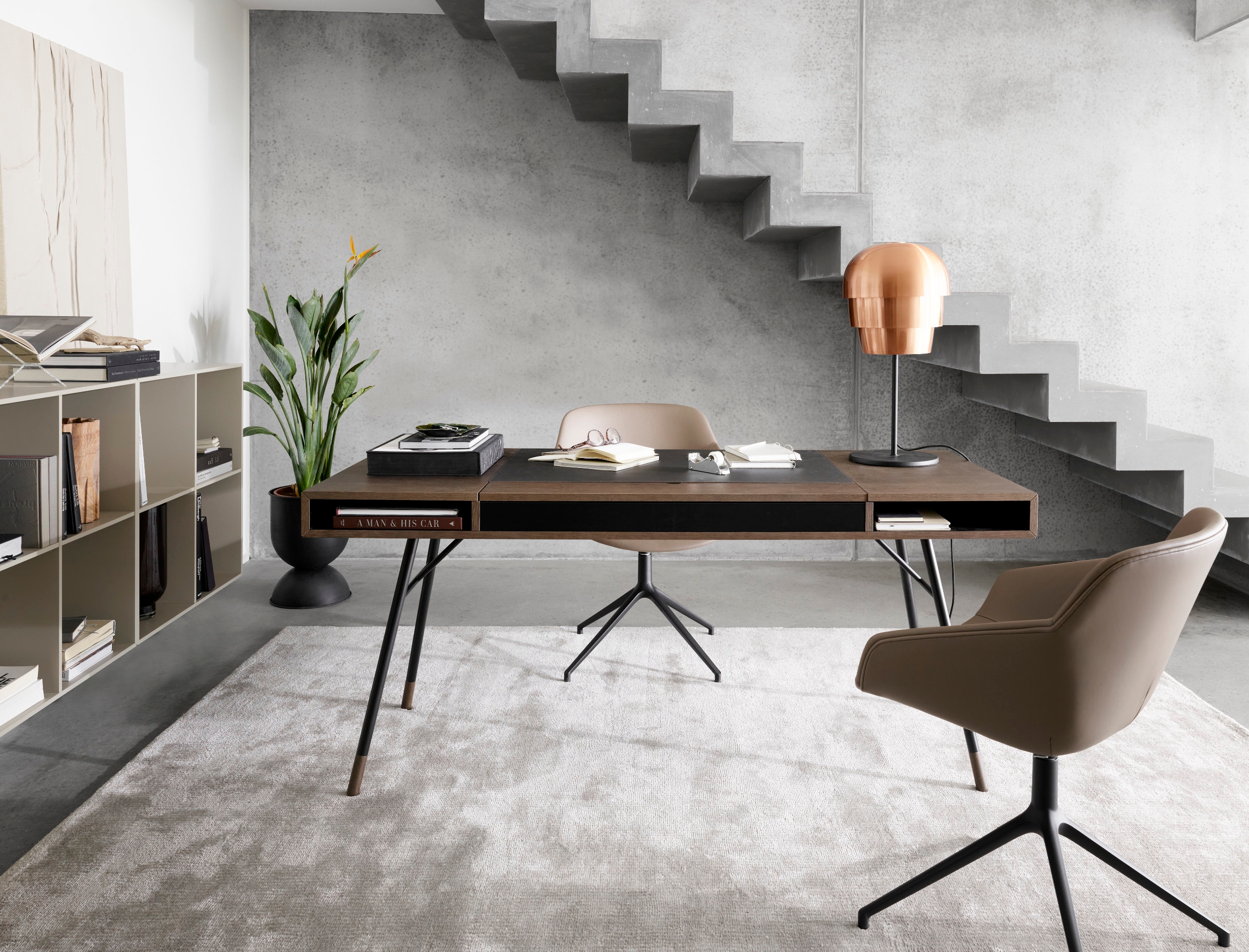 Colours and materiality have an important impact on how we feel in a space, and so do the objects in it. BoConcept's Cupertino desk in dark oak veneer, combined with other pieces in leather, copper and fabric add elegance to the room