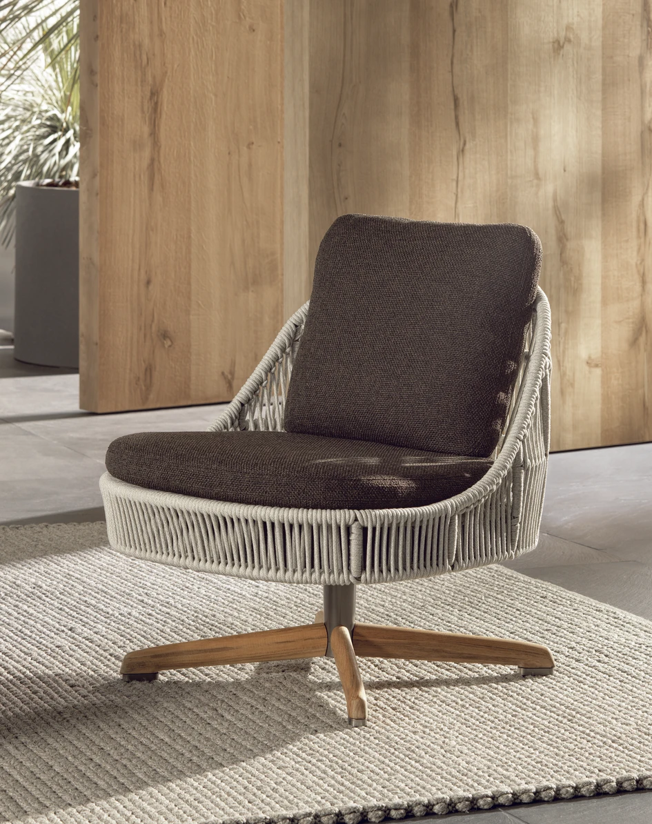 Comfortable and compact, the new Sendai Cord Outdoor armchair smoothly swivels towards the horizon for sunset
