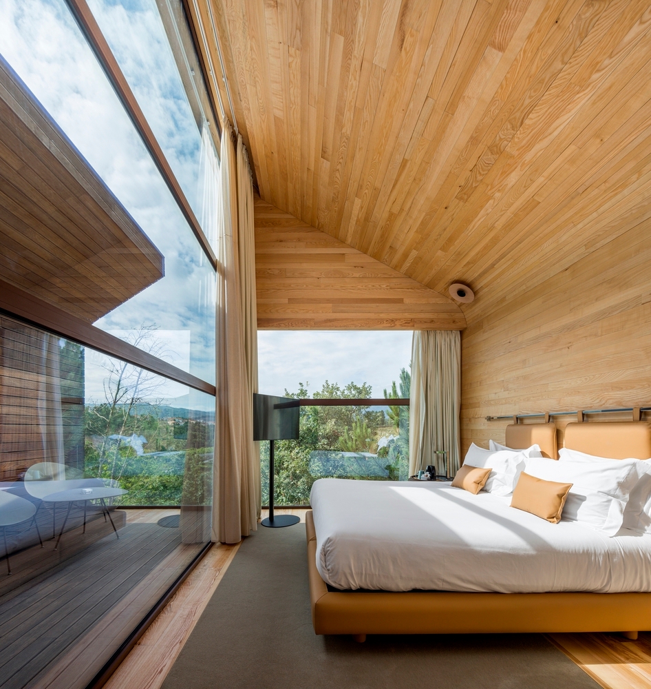 Located on the site of an eighteenth-century manor house, farm and vineyard, the 'Casa da Lavand’eira' is a rural tourism experience hotel, bordered by the Ovil River and connected to the mills, traditional residences and wooden walkways that characterise a local hiking trail. ‘At the western top of the plot is an area favoured by sunlight and landscape views,’ explains project architects FCC Arquitectura, where ‘contemporary-style bungalows were distributed as new accommodation units.’