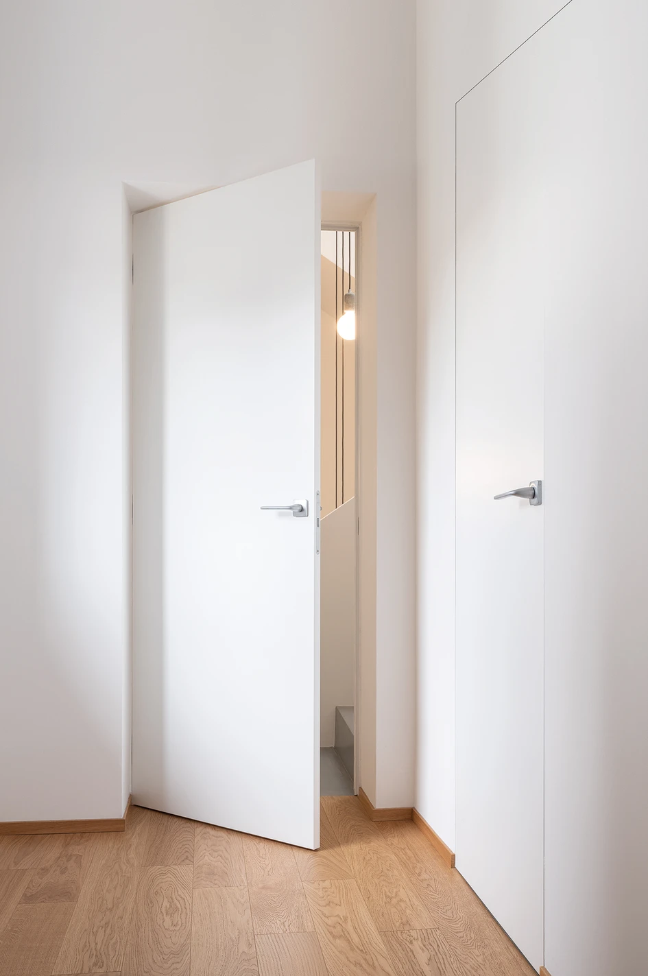 The doors are lacquered to blend with the surrounding walls. It creates a blank canvas against which features such as sculptural lighting installations can shine