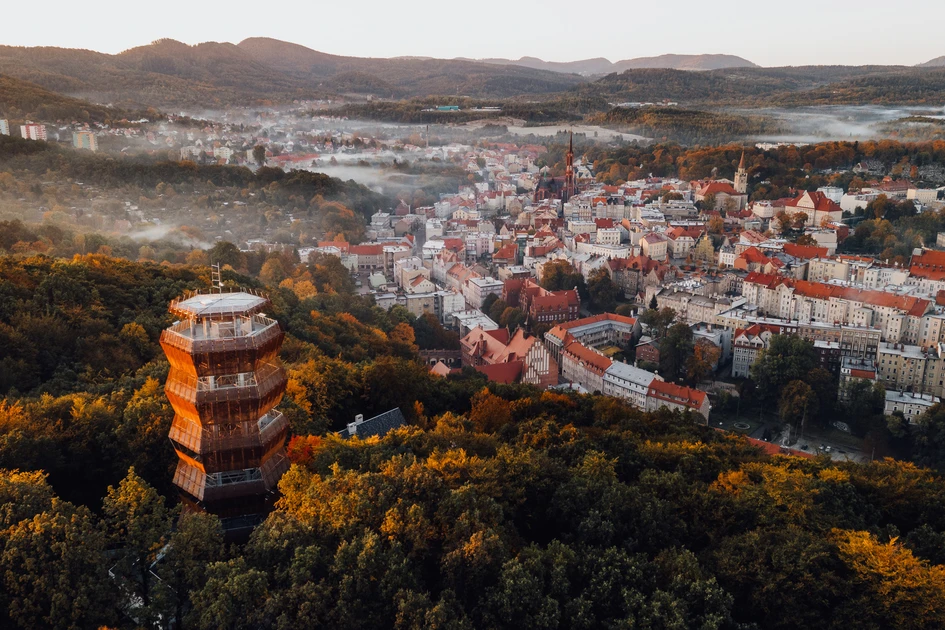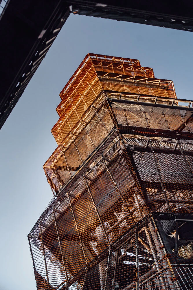 Six stories to sky-ward vision: a rusty steel tower rising from wooded hillsides in southwestern Poland blends industrial past with sweeping views of the Sudetes. Photos: © Maciej Ławniczak