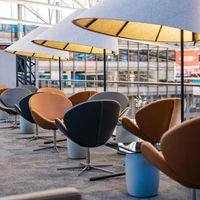 In the VIP lounge at Hamburg Airport, BoConcpet’s swivel function Ogi chairs are used to create comfortable grouped seating areas under acoustic-friendly lamps