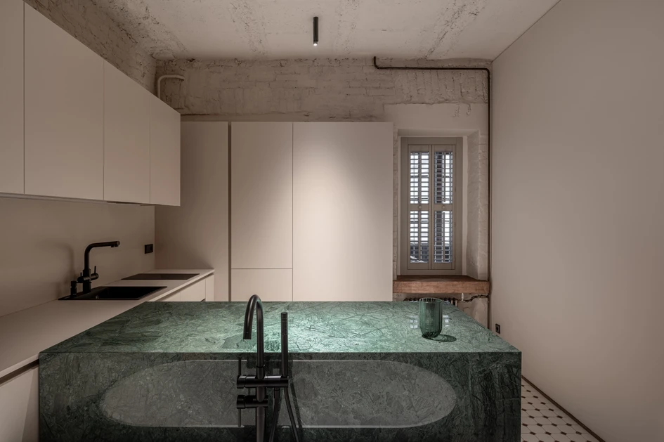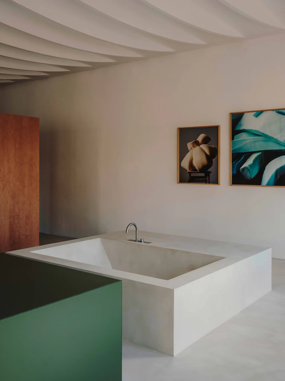 Mesura describes: ‘By maintaining some of its original vagueness, this intervention recognises the client’s way of life by using spatial indetermination to blur the limits of the domestic sphere.’ The bathtub, handcrafted on-site, is positioned near the bed and directly faces the sinks. In this arrangement, everyday fixtures take on an statuesque quality, blending practicality with an artsy aesthetic appeal.