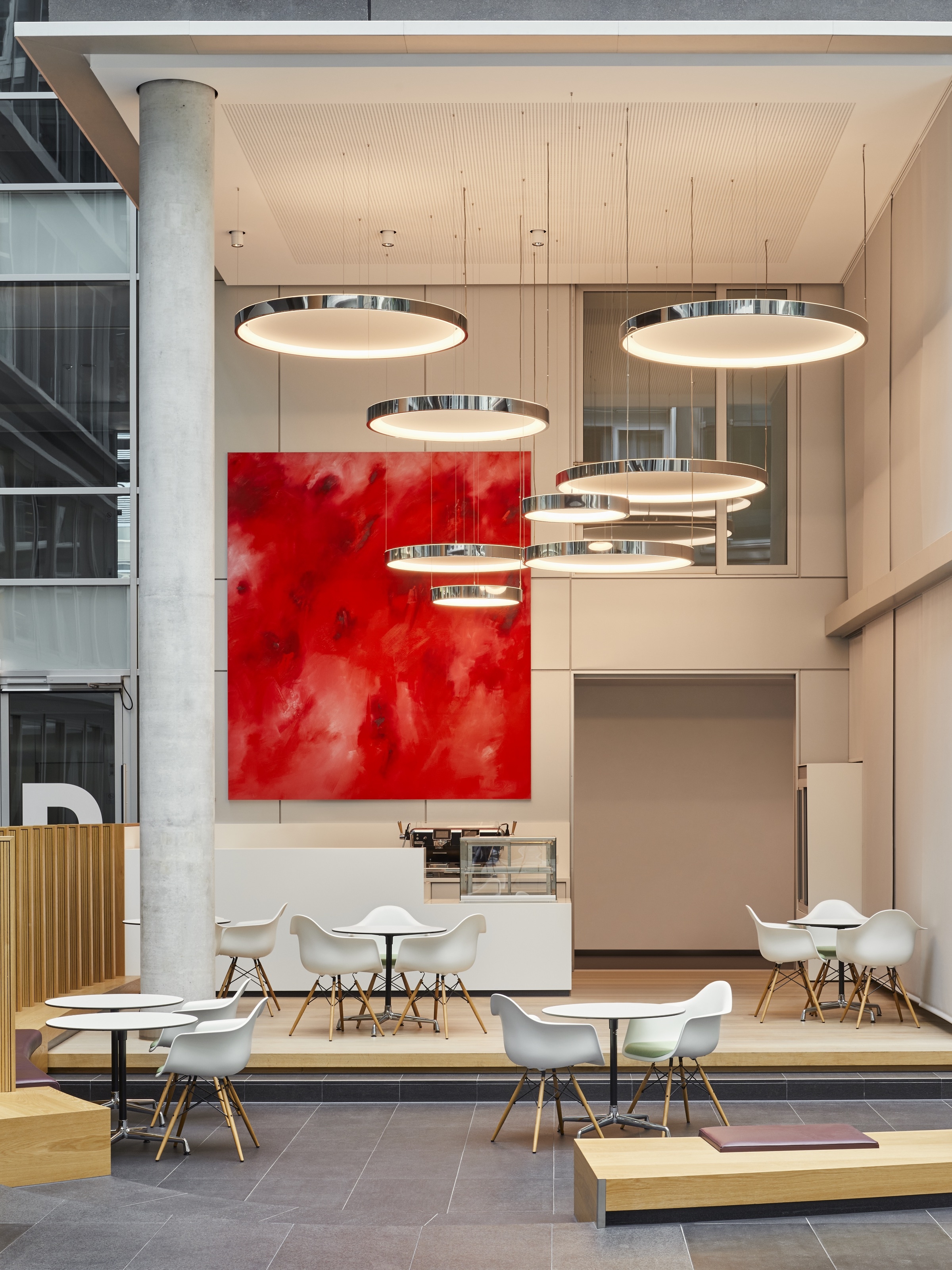 Eight ring lights of different sizes provide a stylish atmosphere in the café (top). The shapely light sail above the reception counter not only serves as lighting but also regulates climate and sound (centre and above)