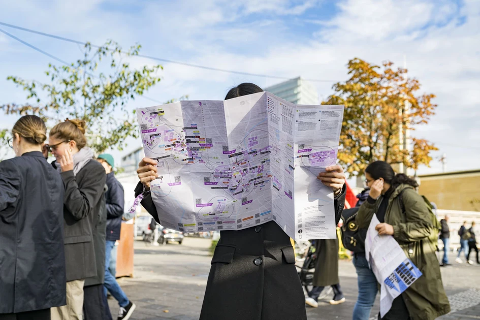 Visitors finding their way around and Miriam van der Lubbe at DDW 24's official opening. Photos: © Max Kneefel & Lotte Dale