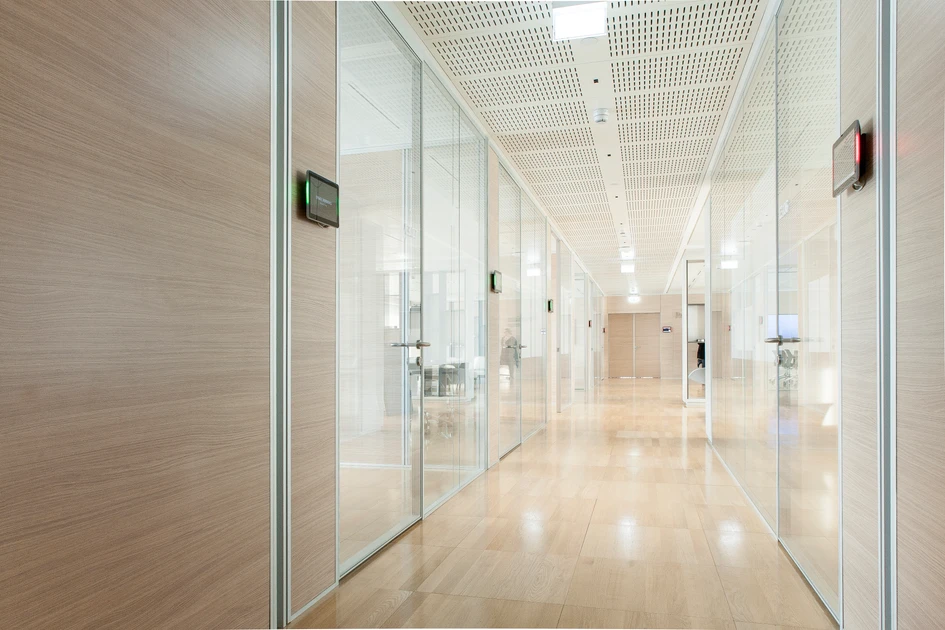 The large open-plan spaces are punctuated with meeting rooms, made entirely of Fantoni I-Wallspace partitions. These are composed almost entirely of high noise reduction double-glazing for minimal visual impact, with some small panels containing wiring, supports for video conference monitors and, near each door, touchscreen systems with which to reserve the rooms themselves and monitor their use. This panelled version of the partition is highly customisable, and in some areas of the building, it also appears around the walls and load-bearing elements, creating a perfect sense of continuity between the different surfaces.