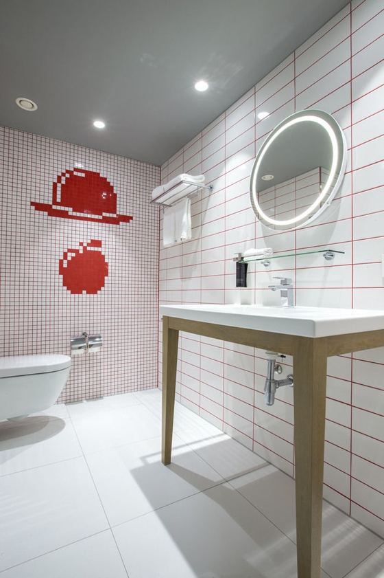 These principles are expressed through customizable furnishings, the graphical look of illustrated walls and wardrobes, as well as fantastic 8-bit graphics made of mosaic bathroom tiles that pay a tribute to the famous Belgian surrealist René Magritte. Modern flat rimless shower trays from Villeroy & Boch’s Architectura MetalRim series ensures the feature walk-in shower fits in beautifully with the seamless flow of space that surrounds it.