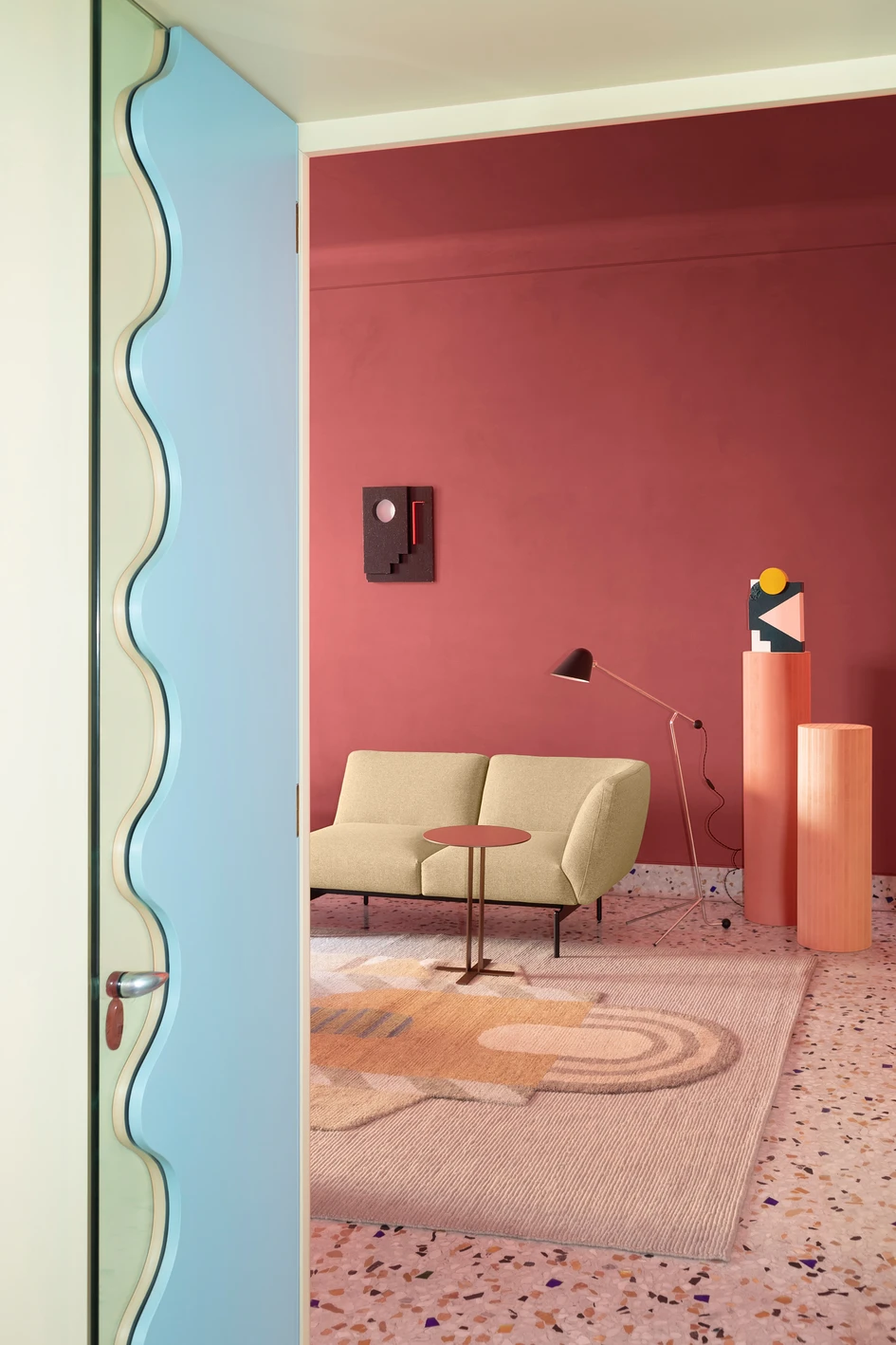 The quirky nature of Saba’s Baby Geo armchair is accentuated by mid-century-style lighting and ceramics: the Tutankhamon vase is a collaboration between Mendini himself and the artist Paolo Gonzato