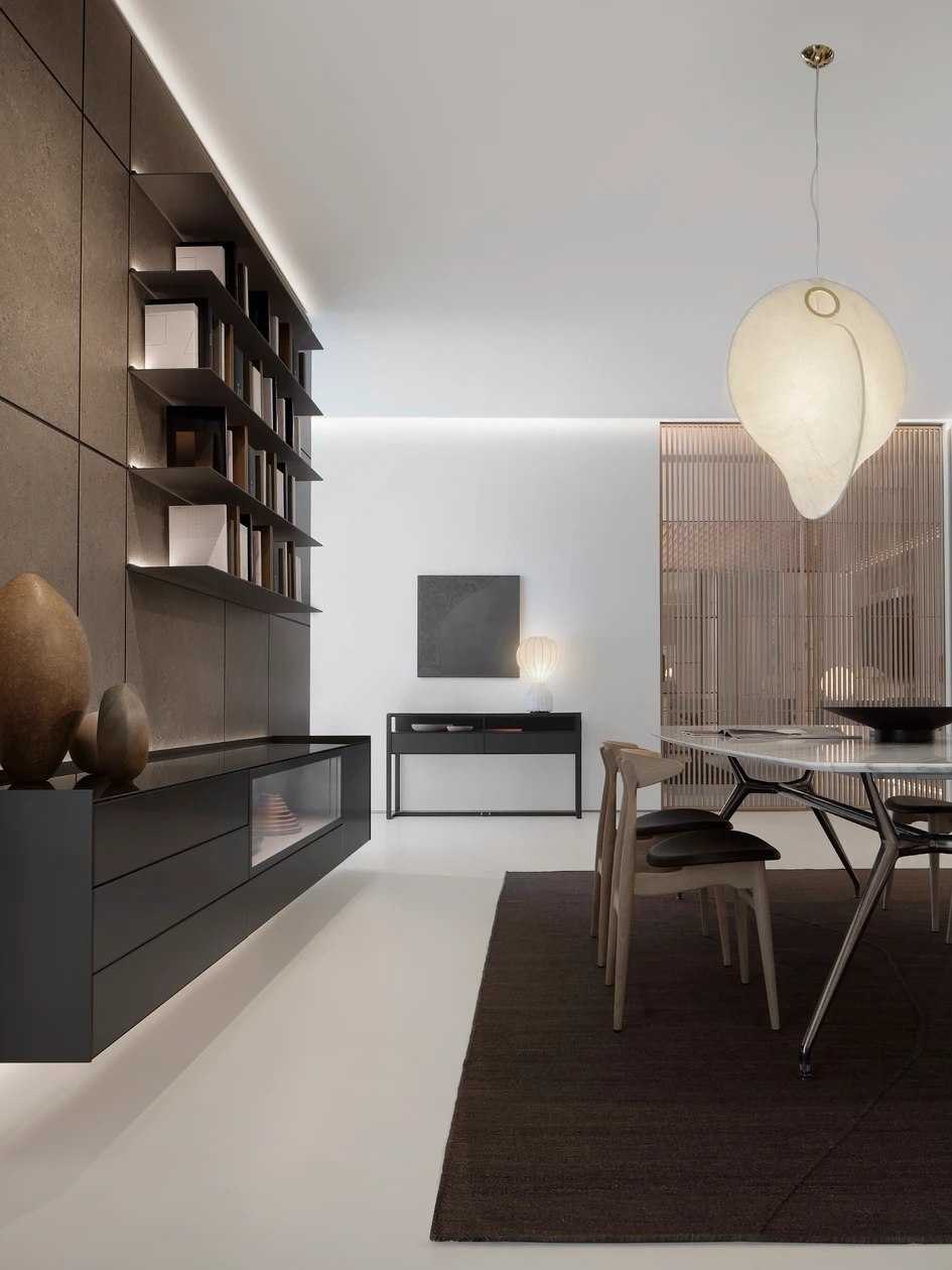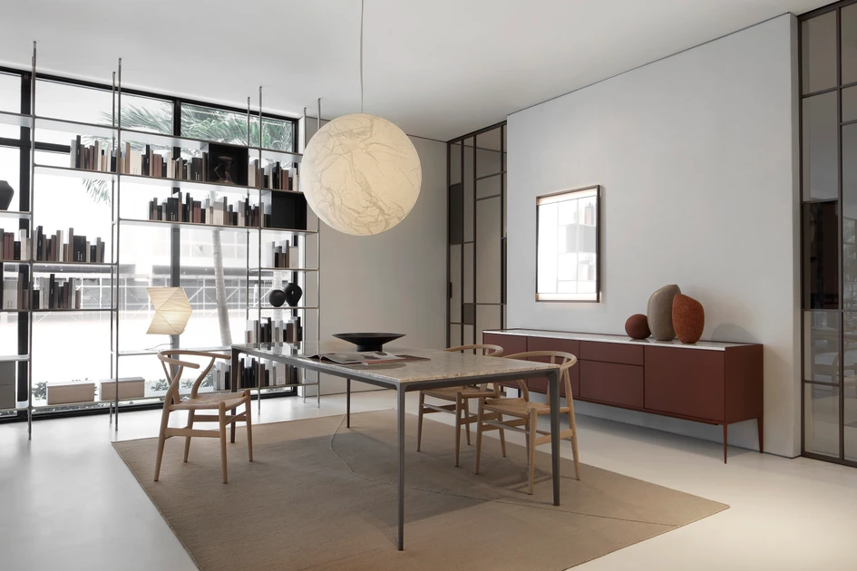Among the key products on display is a curated selection of tables and completing designs from the Rimadesio Collection: Modulor boiserie system takes center stage, covering almost the entire showroom’s walls with finishes in sound-absorbing fabric, Litech, wood, and raffia. The Rialto collection is showcased through coffee tables and sideboards, while standout tables include Manta and Long Island. The night area features an extensive Cover walk-in closet system, complemented by Alambra and a small home studio corner created using the Self system integrated into Modulor.