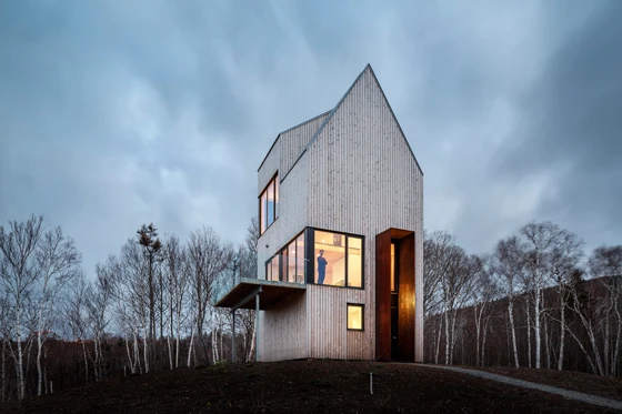 Architect Omar Gandhi and Design Base 8's Rabbit Snare Gorge project in Canada's Nova Scotia features an archly gabled roof, Corten-steel-framed entrance and a glazed, first-floor balcony. Photos: Doublespace Photography