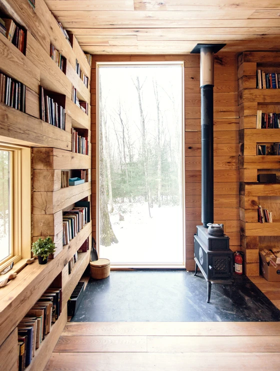 Studio Padron's diminutive Hemmelig Rom (Norwegian for 'secret room') in Upstate New York, with blackened facade, functions as both guest room and library. Fotos: Jason Koxvold