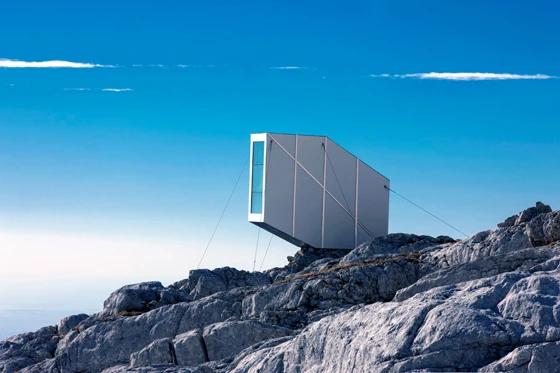 Intrepid climbers who make it to the top of Mount Kanin in Slovenia can take refuge in OFIS Arhitekti’s dramatically cantilevering micro cabin, which is tethered in place by a series of cables. Fotos: Janez Martincic & Ales Gregoric