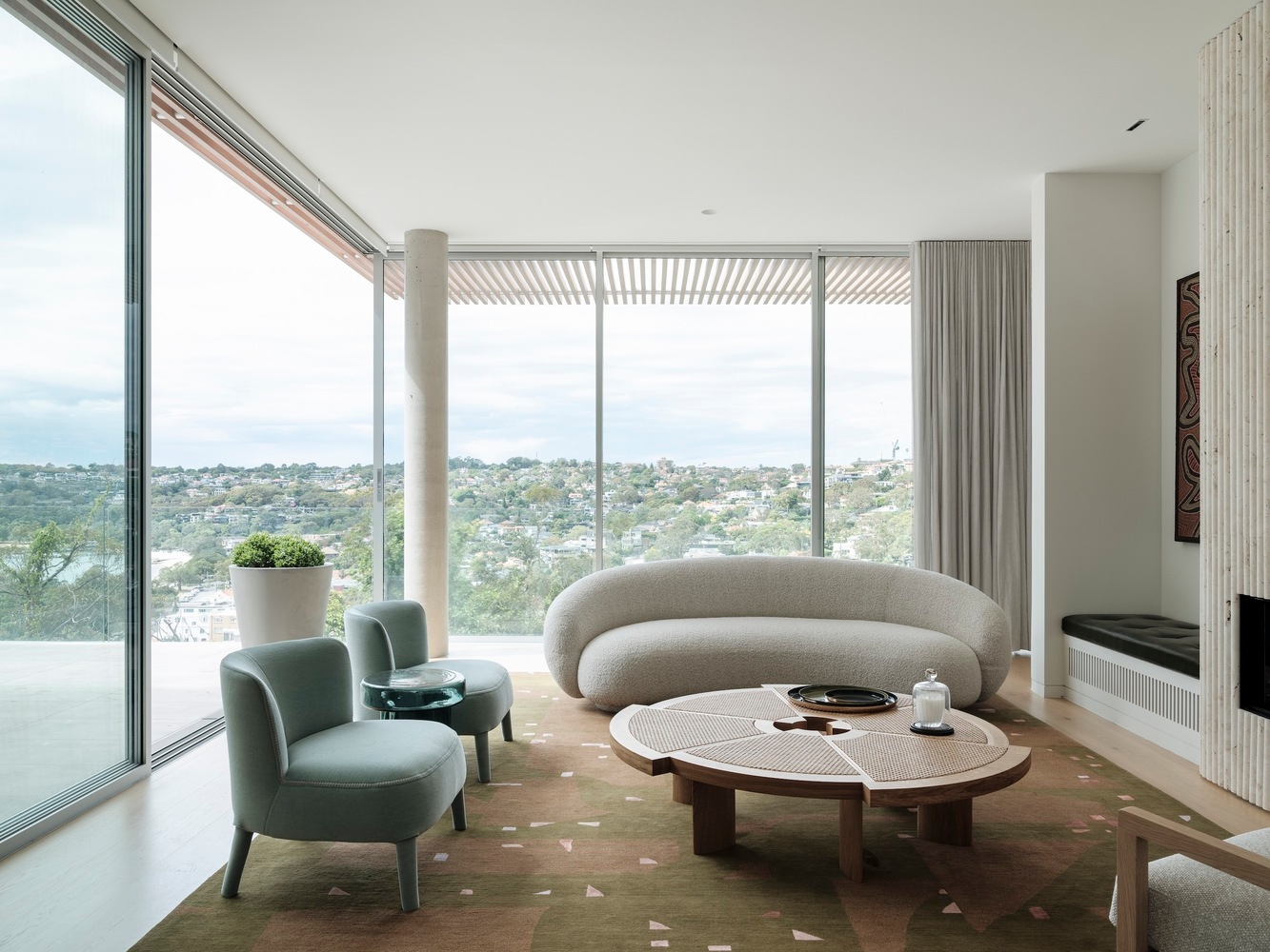 Palm Frond Retreat (top) and Canning Street House (middle) break down their contemporary clean lines with organically shaped furniture. Élitis' Kool Havane rug (bottom) adds shape from the ground up. Photos: Tom Ferguson (top), Eve Wilson (middle)