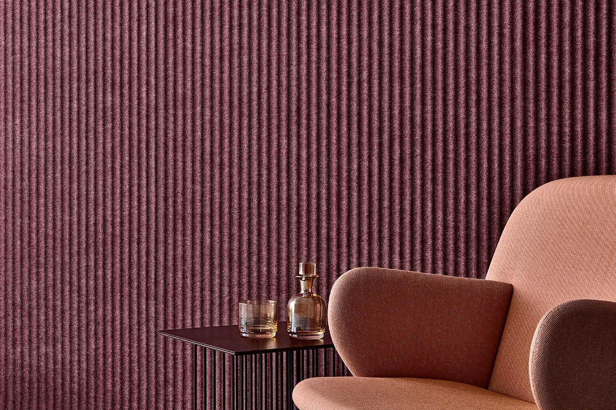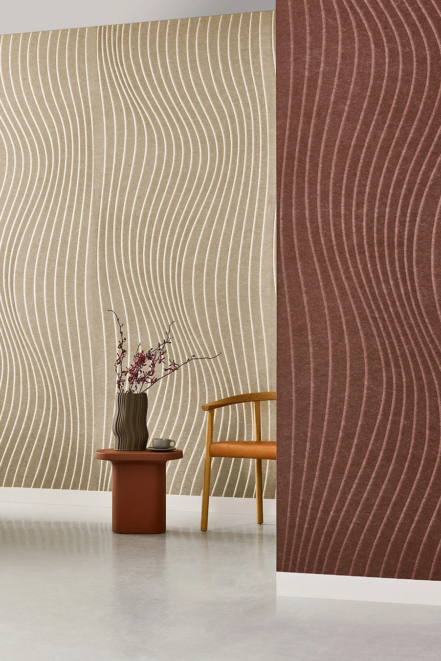 While the embossed collection explores surface as landscape, the 3D formed series pushes the boundaries of scale and depth. Born from Woven Image’s pioneering spirit – and an ingenious modification of decommissioned manufacturing equipment – the company’s foray into 3D acoustic design began with the Fuji series of tiles. This breakthrough in forming technology opened new possibilities for large-scale, floor-to-ceiling acoustic panels that blur the line between wall architecture and sculpture.The latest additions, Column and Curtain, extend this innovation into striking vertical installations. Column draws inspiration from the symmetry and cadence of classical architecture. Its wave-like peaks and troughs, reaching a depth of approximately 70mm, create generous air gaps that enhance acoustic performance. The design’s rhythmic undulation conveys both strength and stillness – a contemporary homage to the fluted column, reimagined for modern interiors. In contrast, Curtain offers a softer counterpoint. Its asymmetrical drapery-like form flows gently across the wall, producing a macro 'curtain effect' that delivers high acoustic performance while introducing a sense of sculptural fluidity – a textile rendered in hard form. Both designs are conceived at architectural scale, transforming walls into immersive surfaces that capture sound, light and emotion in equal measure.