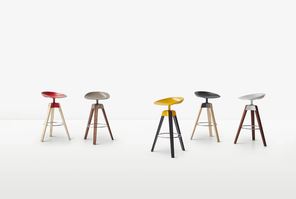 With more stability and additional visual interest, three-, four- or five-point bases are a common choice. Bonaldo’s Plumage stool, for example, utilises all the aforementioned materials at once with stunningly contrasting colour and texture. If clean, straight lines are your bag, however, then fixing one leg to each seat corner provides a nicely squared, ordered quality. With four straight edges, a line of stools like Team 7’s Ark has a pleasingly organised military look to it, when they’re all standing to attention at the bar.With more stability and additional visual interest, three-, four- or five-point bases are a common choice