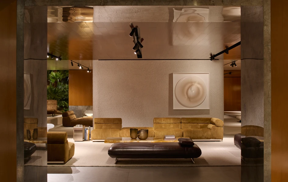 The Coupé seating system by Giampiero Tagliaferri inspired an interior where Californian modernism meets 70s Italian design. GamFratesi’s Vivienne seating system thrived in a timeless contemporary space of decorative elements and layered materials. While a rationalist modern space with textured surfaces of Iranian travertine, oxidised steel and glazed tiles complemented the personality of Riley’s seating configurations by Hannes Peer.Interiors were enriched by masterpieces from the Tornabuoni Arte collection, a renowned Florentine gallery, in an exclusive partnership born out of a shared appreciation for Italian cultural excellence. Tornabuoni’s expertise in 20th-century Italian art brought depth and authenticity to the exhibition space, elevating the entire display to a dialogue between design and art.