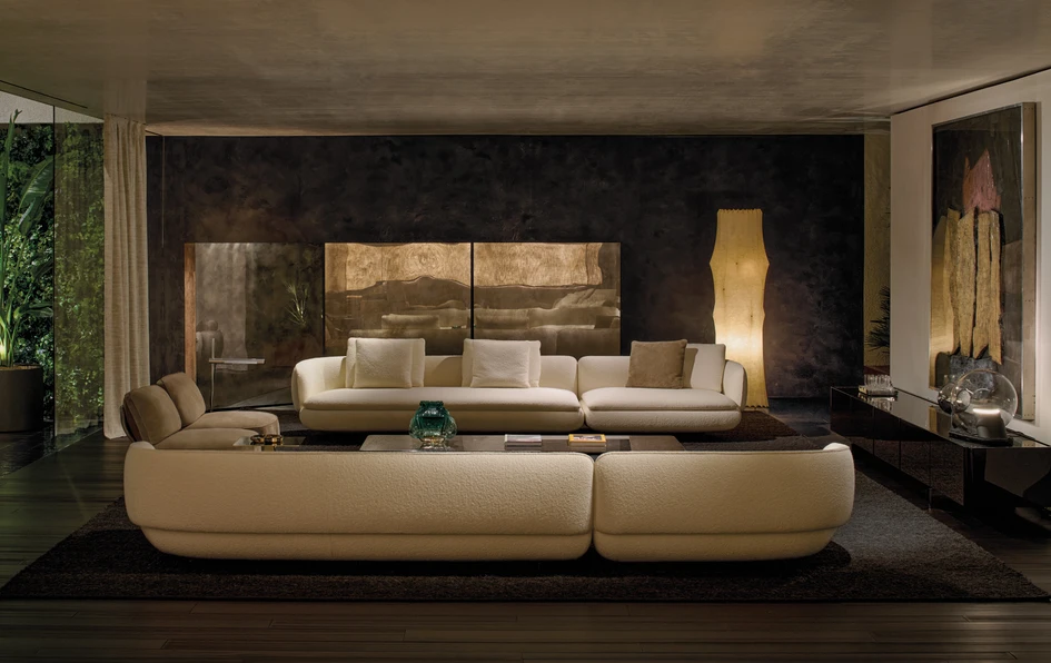 Visitors entering the Minotti Pavilion at this year’s Salone del Mobile were treated to five contemporary living concepts that draw equally on tradition and innovation.