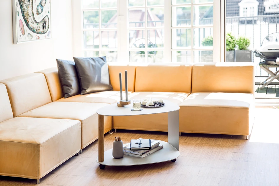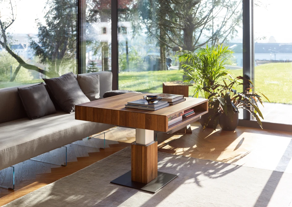 Ozzio Italia’s Box coffee table is particularly impressive in the latter realm. In its original state, it resembles any other sleek, low coffee table design, but when extended to full height and length, it provides space for up to eight dinner guests at once. While TEAM 7’s lift coffee table isn’t quite as transformative, it can be adjusted in height from 35 to 71 cm by means of levers on the bottom side and offers extra built-in storage.