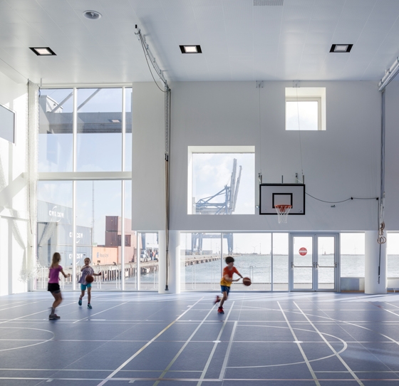 Located on an extension of the former quay, the school’s location is not only on the water but literally in the water, creating unique views and relations to the port basins and the potential for a completely new relationship between a school and the surrounding cityscape.