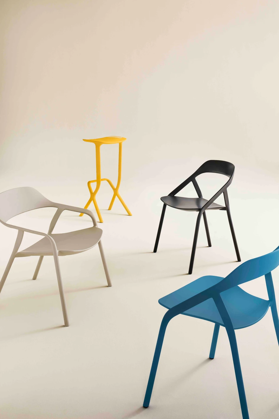 The minimalist and lightweight LessThanFive Guest Chair and Stools in an informal and stylish canteen setting