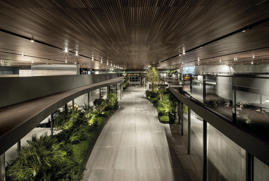 The two-level Minotti Pavilion 2023 incorporated the aisles of the exhibition, creating a mix of public and private space ideal for envisioning multi-dimensional domestic and hospitality design projects. Its central boulevard, enriched by Mediterranean landscaping, showed Minotti’s revolutionary approach to exhibition design. The organic architecture featured large curved windows, two spiral staircases and two sculptural cone-shaped fireplaces, an iconic architectural presence reflective of the language of the brand.