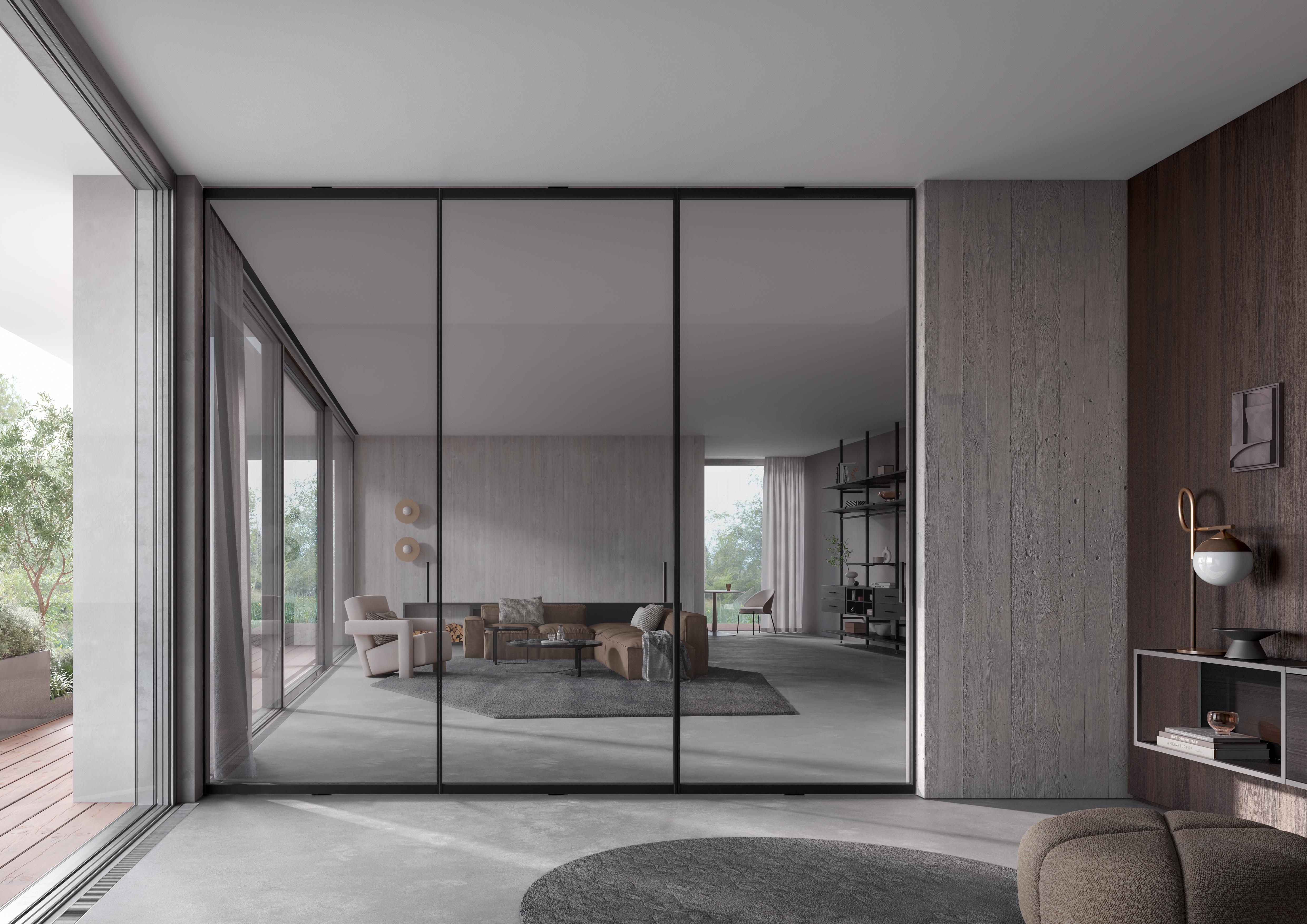 Transparent pivot doors enable seamless room transitions, fostering flexibility and openness in interior design