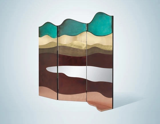 Délabré black iron, polished steel, brushed copper and délabré brass combine to create these extraordinary landscapes on screens by Alessandra Baldereschi which serve to demonstrate the chromatic shades made possible by oxidation