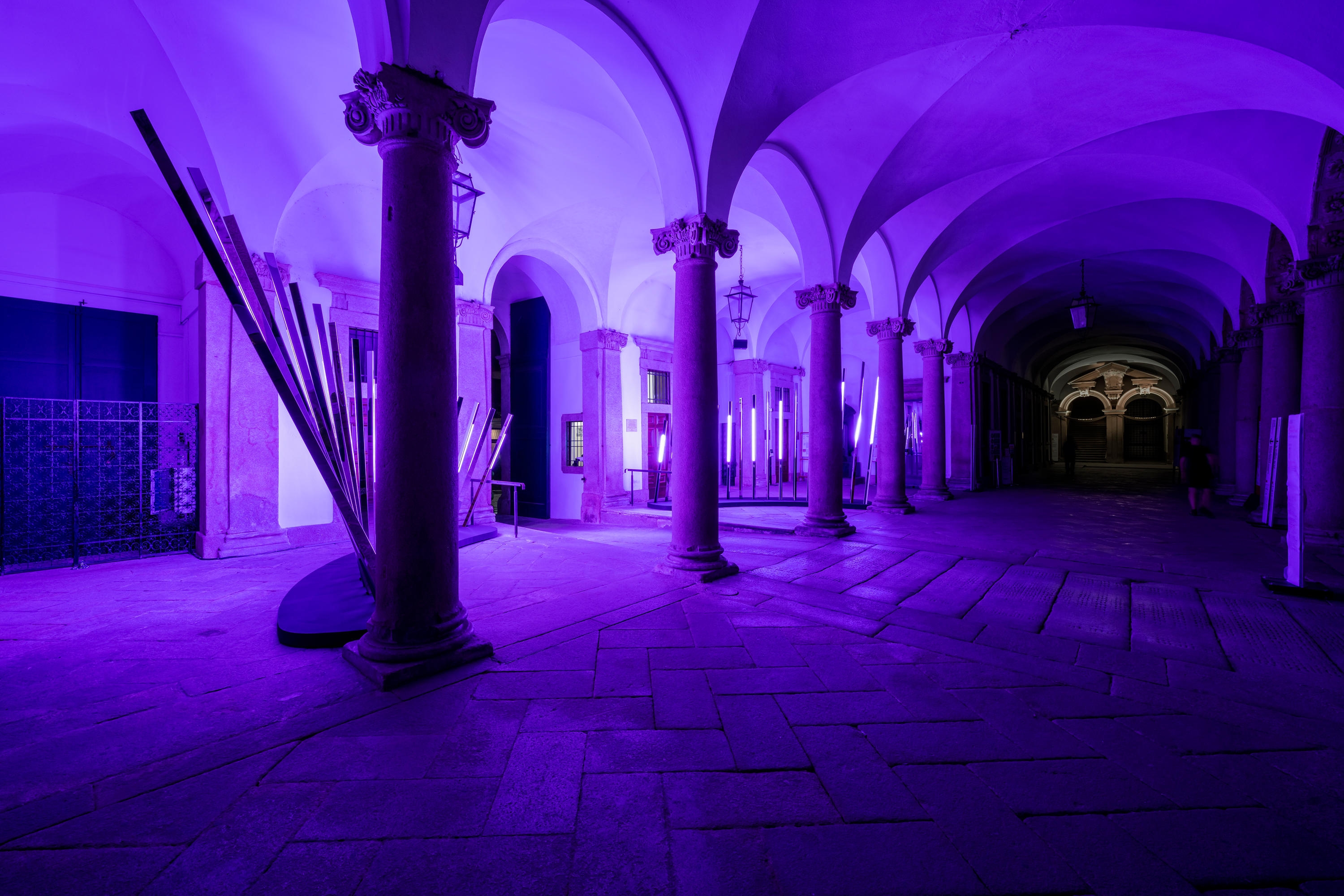 The Transsensorial Gateway uses sensors to create a unique choreography of light and sound, reacting to the presence of visitors at the 17th-century portico in Milan, Italy. Photo: Alex Filz