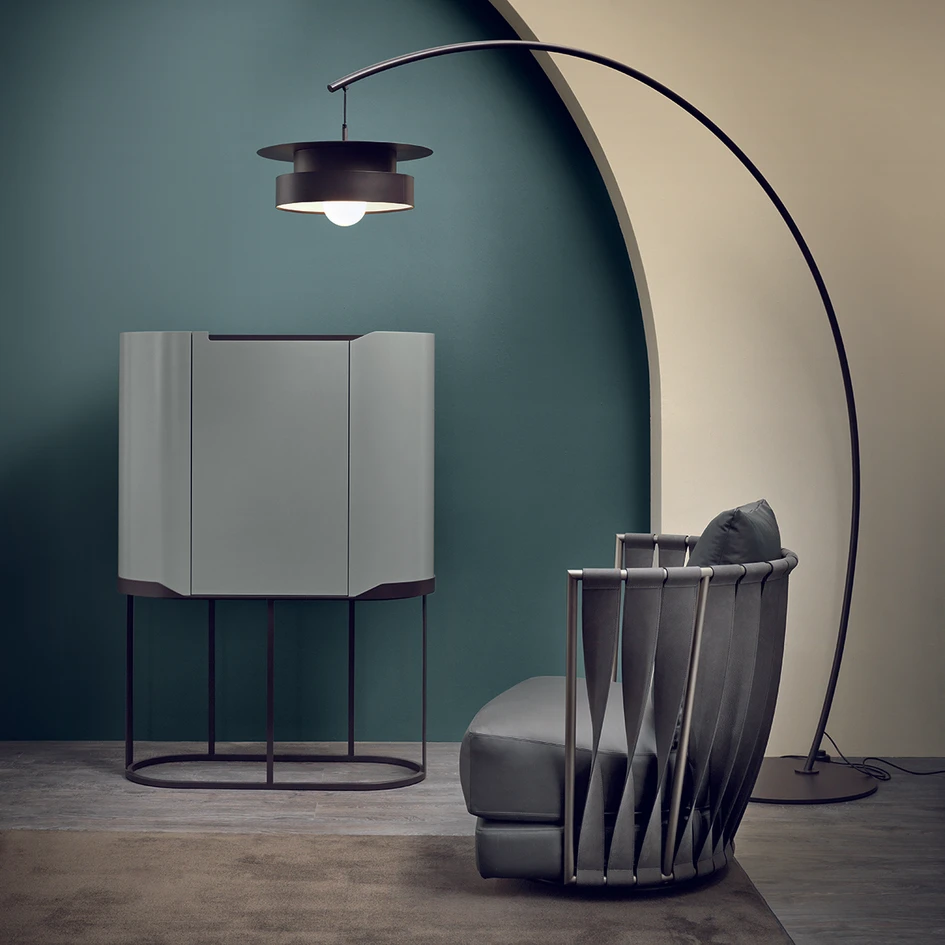 The Oasi sideboard reads as both sculpture and structure. Its defining metal frame sweeps in continuous curves around the wooden body, tracing a fluid architectural line that defines its silhouette. The piece appears to hover lightly above the floor, supported by an elliptical steel base that lends both stability and grace. There is a sense of motion contained within stillness, an equilibrium of forces that gives the sideboard its calm authority.The piece appears to hover lightly above the floor, supported by an elliptical steel base that lends both stability and grace