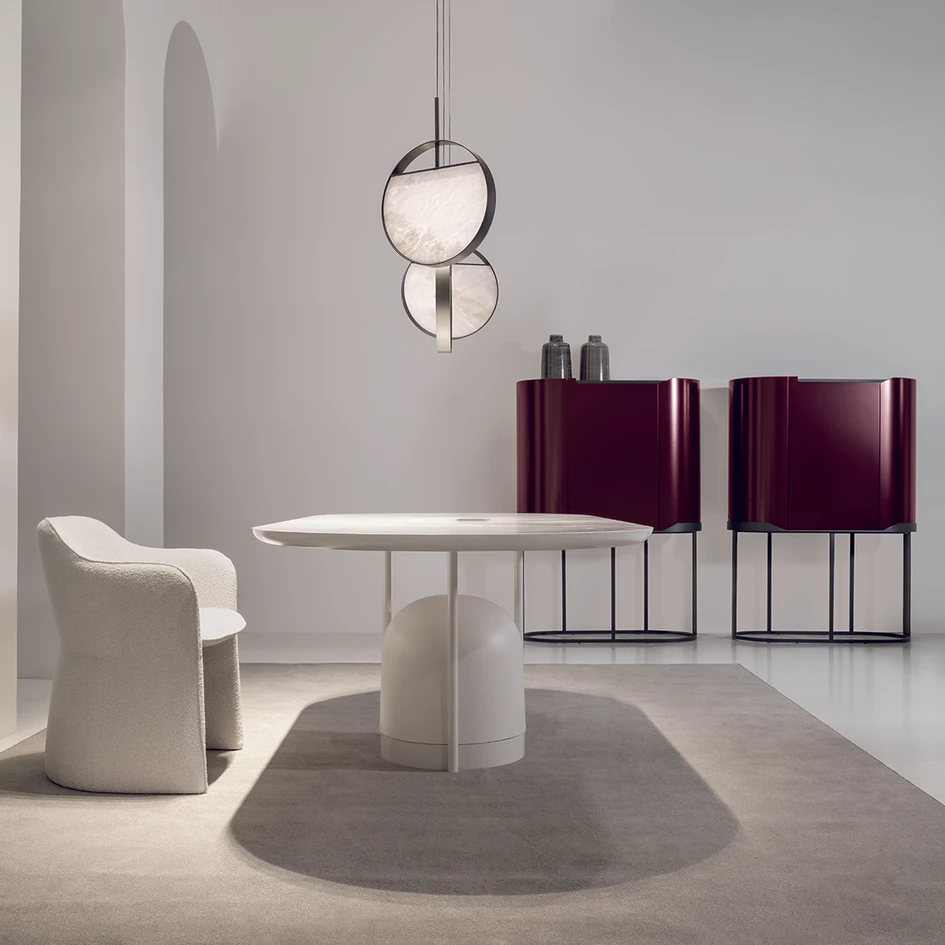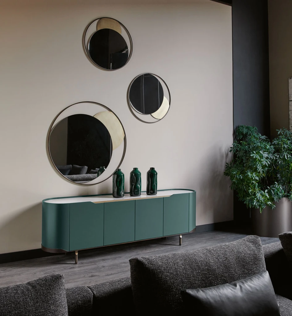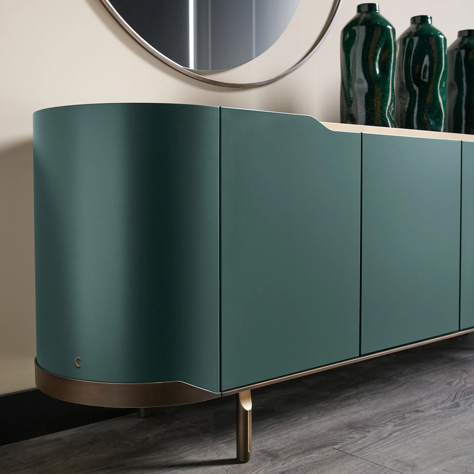 The Oasi sideboard is built on the principle of balance, not only in structure but in tone. Its top may be realised in wood for coherence and warmth, or finished in marble or stone for tactile contrast. Cantori’s wide range of finishes allows the piece to adapt without losing its identity. Whether rendered in soft metallics or grounded in deep natural hues, Oasi sustains the same visual rhythm: curved, continuous and calm.