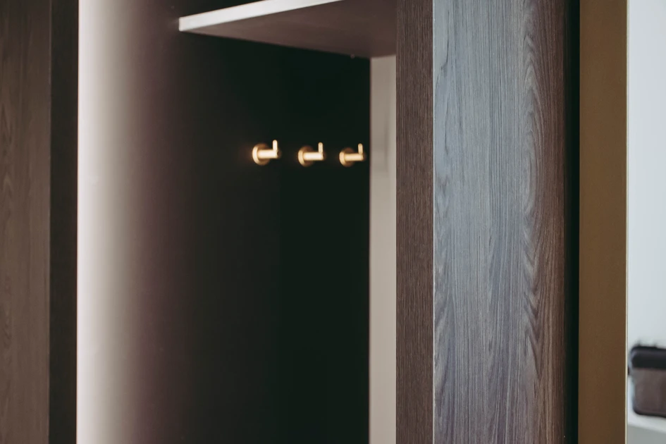 Inside the bedrooms, the panelling was extended to create built-in furniture. Open cupboards and storage areas for clothes are enhanced with brass accents