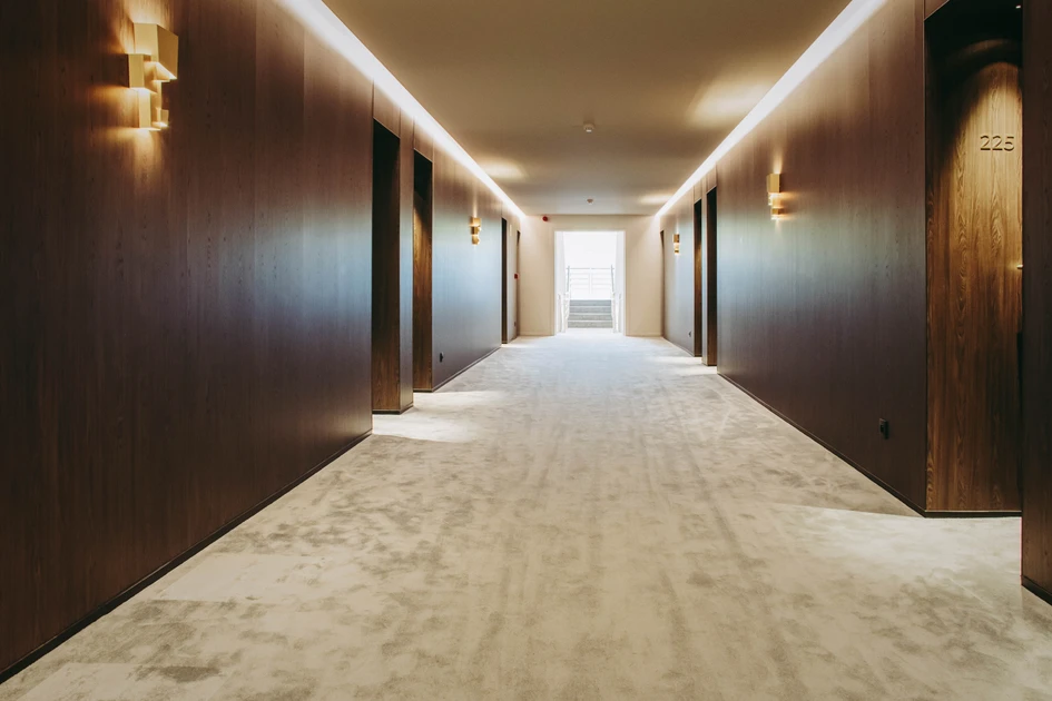 New walls were created using Unilin’s MDF panels in Dainty Oak Café Noir in combination with Juunoo partitions, bringing an elegant warmth to the corridors and landings