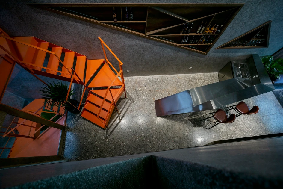 The narrow Bao Long Office in Ho Chi Minh City knocks through into the neighbouring unit to connect the mixed-use development with a striking orange staircase. Photos: Quang Dam