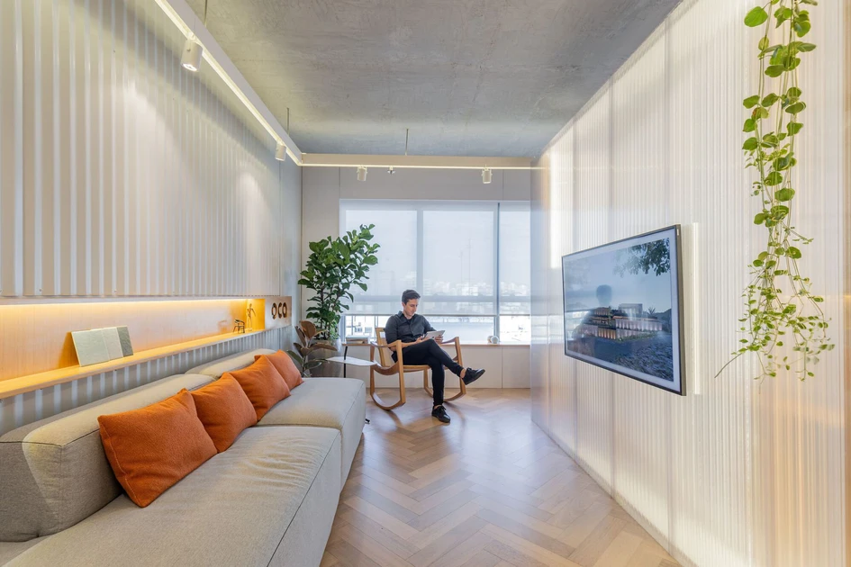 Instead of using the thick, opaque material of a curtain to separate opposite office areas, the Oficina Conceito Arquitetura selected a polycarbonate material to form its central wall. Sitting between the architecture studio’s main workstations and client presentation space, ‘the volume divides the two main environments in a translucent and illuminated way, thus providing the desired privacy and diffusing light throughout the day,’ explain the architects themselves.