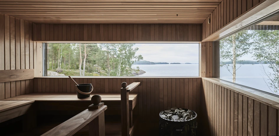 The heart-shaped building sits ‘between rocky areas on each side to form a tranquil cove,’ explain architects Studio Puisto, blending into the delicate Saimaa scenery with its dark exterior and a streamlined point of entry that opens out to present panoramic views from the rear terrace. Alongside the restaurant, meanwhile, sits the additional sauna building, also featuring a ‘round opening in its roof to create a thematic link between the two buildings,’ explain the architects Studio Puisto, as well as wide windows that allow sauna-goers to enjoy the views along with the heat and humidity, too.