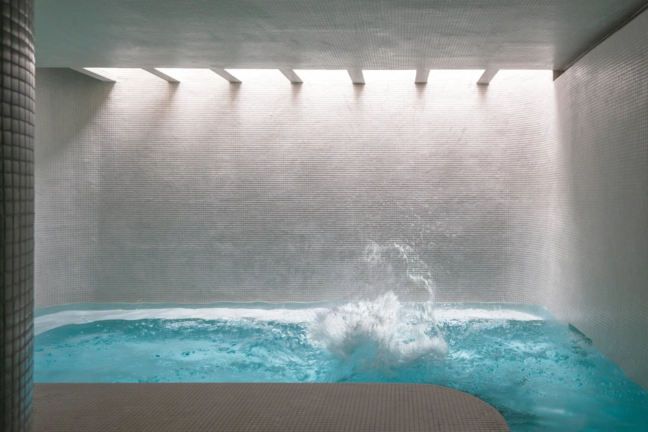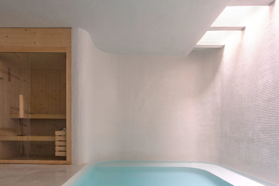 This domestic community in Madrid utilised its underground level as a ‘space for body wellness’ as architects Pachon-Paredes introduce. The design arranges rooms and their programmes according to levels of humidity, temperature, pressure and use, meaning users are first lowered into low-humidity areas such as a changing room and gym, before moving out to the spa and pool with sauna at the ends.