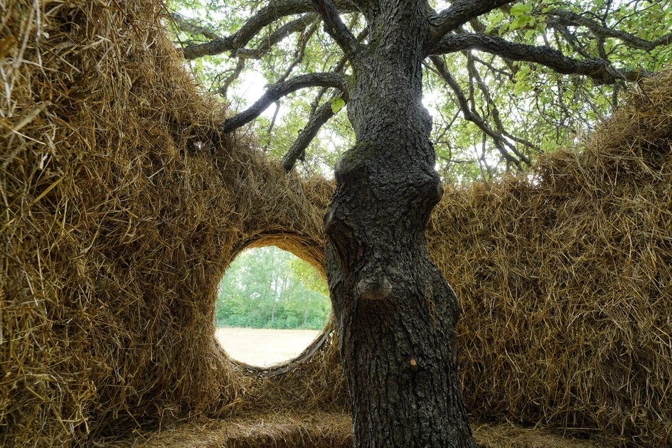 One Tree Four Seasons is a project that utilises the natural setting of a lonely tree in the centre of a field for a variety of artistic purposes. After encircling walls around the tree by weaving together deadwood from the surrounding forest, then forming a floor, seats and insulating interior walls using hay from the field it resides in, the tree space was wrapped in plastic and transformed into a sauna.