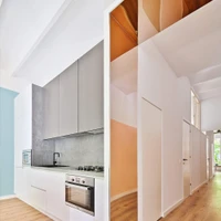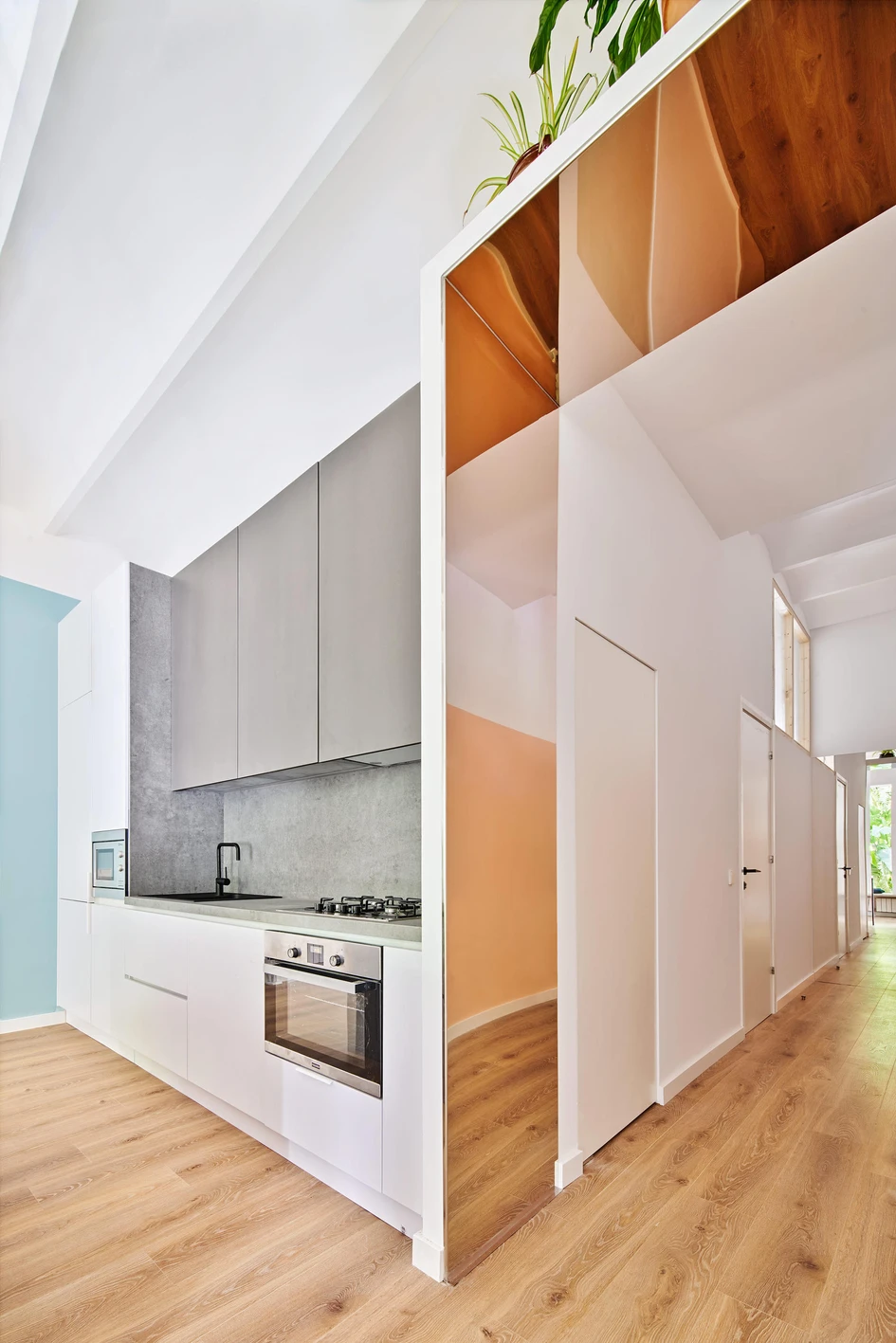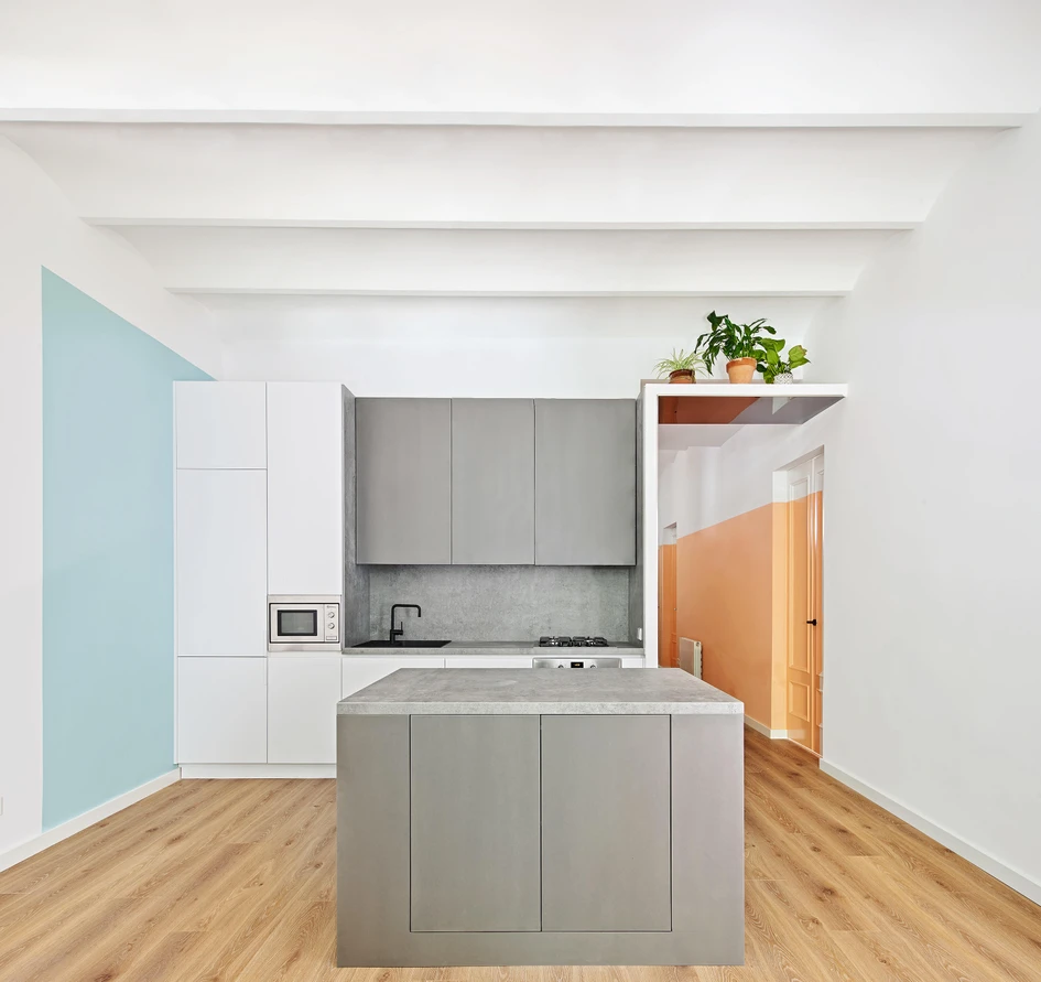 In the Magic Box Apartment, Raul Sanchez Architects deliberately create blurred boundaries between the living room, the open kitchen, and the hallway that connects the rest of the space. Photos: José Hevia