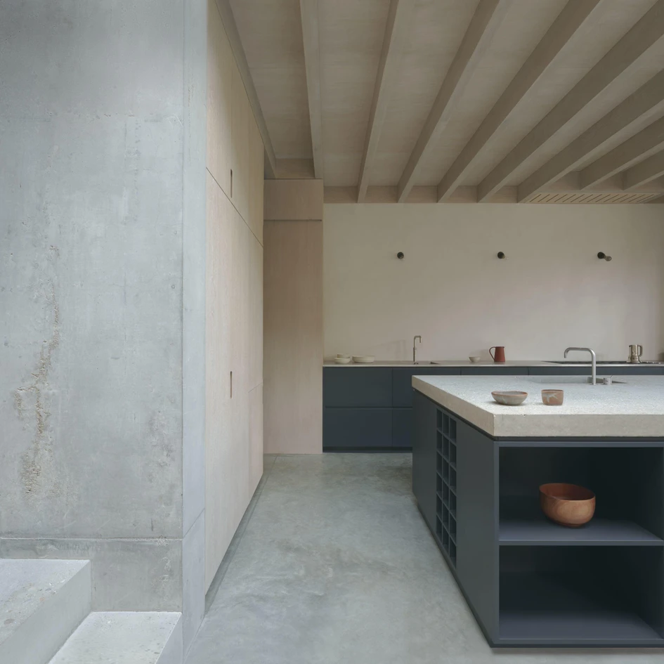 DGN Studio's Concrete Plinth House features a pared-back open kitchen which is visually connected but functionally separate from the rest of the house. Photos: Nick Dearden