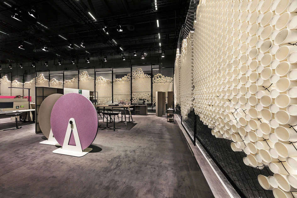 Palmberg’s stand at this year’s edition of Orgatec – designed by Frankfurt-based agency Voss+Fischer – featured the familiar paper coffee cup as leitmotif for its bold and expressive concept