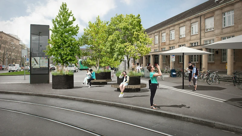 For the time being, Basel is focussing on pragmatic, fast-acting measures. Renovation projects for streets and squares that are already underway are being reviewed for climate improvement options. In the detailed plan, it is often still possible to replace sealed surfaces with gravel and greenery. In contrast, Triangle Square, which was created a few years ago, was given a subsequent facelift with the addition of almost 20 trees. And soon, 80 trees and shrubs will line and cool the popular Rhine riverside path between the Dreirosenbrücke bridge and the French border."We need to green, shade and irrigate," continues Basel Councillor Esther Keller. Large areas in the city must also be cooled. The executive envisages specific heat reduction measures for around "80 hot and highly frequented places". Where trees cannot be planted, mobile elements are to provide shade. Greenery can also be organised with movable pots and planter boxes. Further plans include greening façades and unsealing areas according to the sponge city principle. The Basel government is applying to the cantonal parliament for expenditure of CHF 9.4 million for this purpose. In addition, the authorities want to create more incentives for private property owners to remodel their properties to reduce heat.
