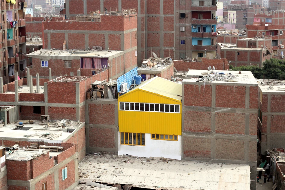 The vibrant yellow hue in the facade of Dawar El Ezba Cultural Center optimises sunlight reflection, illuminating the interior given the narrowness of its urban setting. Photos: Ahmed Hossam Saafan