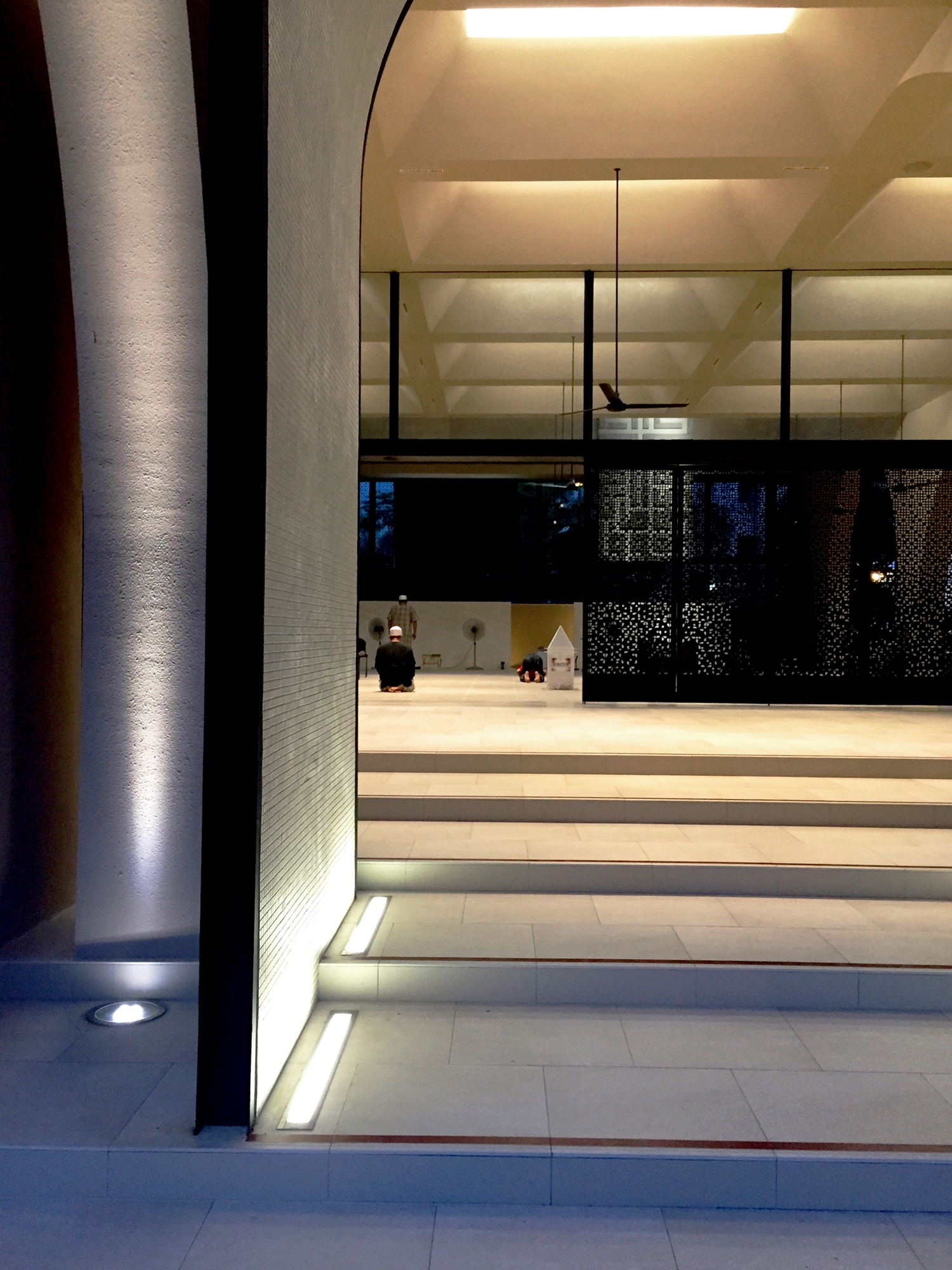 Linked by a series of grand landscaped terraces from the street, this elevated landscape deck becomes like a public square where 3 distinct volumes housing the Main Prayer block, Islamic Learning Centre and Administration block, sit. Correspondingly, it lends itself as a spill out area for events and activities serving the three program functions, as well as extended praying spaces during peak usage.