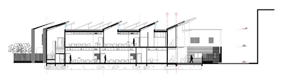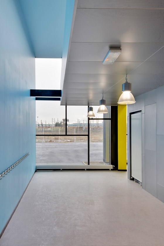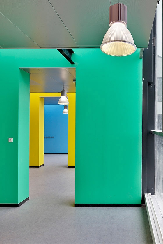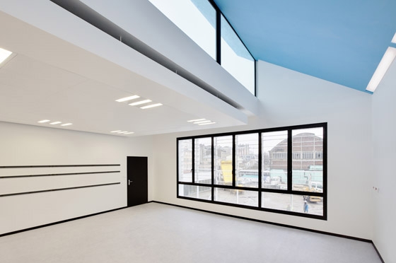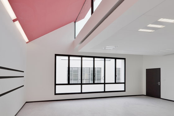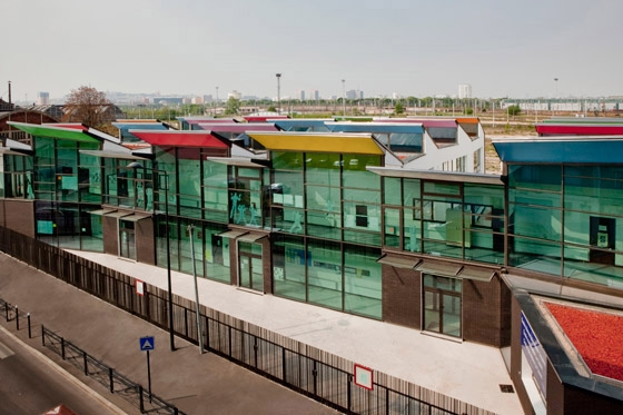 Being a building on two levels, its roof will be apprehended as a pedestrian scale because of the surrounding high buildings. The roof therefore is designed like a crucial factor of the project; it is the fifth façade seen from the rue de Bailly by the children like a bright coloured pallet, visible from the surrounding high buildings in the shape of thin straps of vegetation cut in the sheds.
