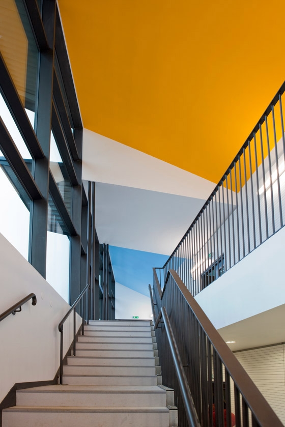 The esplanade is designed like a space of hospitality, protected and covered by a playful light shelter. Its base of brick is extended in the building by an internal brick street which functions as an interspace area to access both schools, the recreation centre and at the same time serve like the connection area for the various functions.