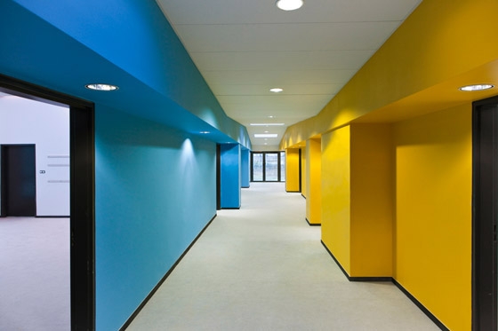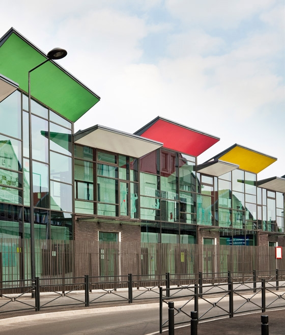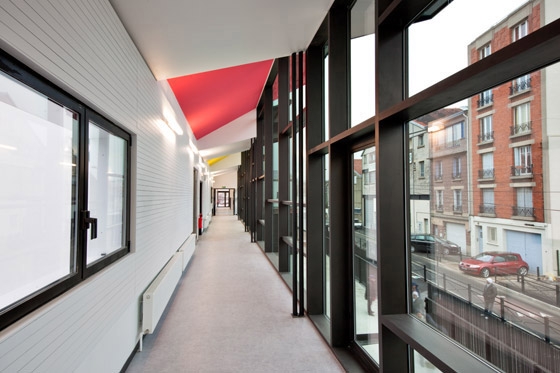 The body of the building seen from the rue de Bailly shows a glazed screen printed façade to protect the intimacy of the children, giving the possibility for transparency in the interior gardens and under the coloured ceiling.