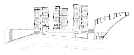 Each schoolyard is extended visually one level higher by the garden, accessible by a ramp connected from the schoolyard. These gardens, important for the class rooms on the higher levels, bring freshness to the project and enable the children to get fresh air between the lessons and to connect with the schoolyard while walking on the protected and planted way.