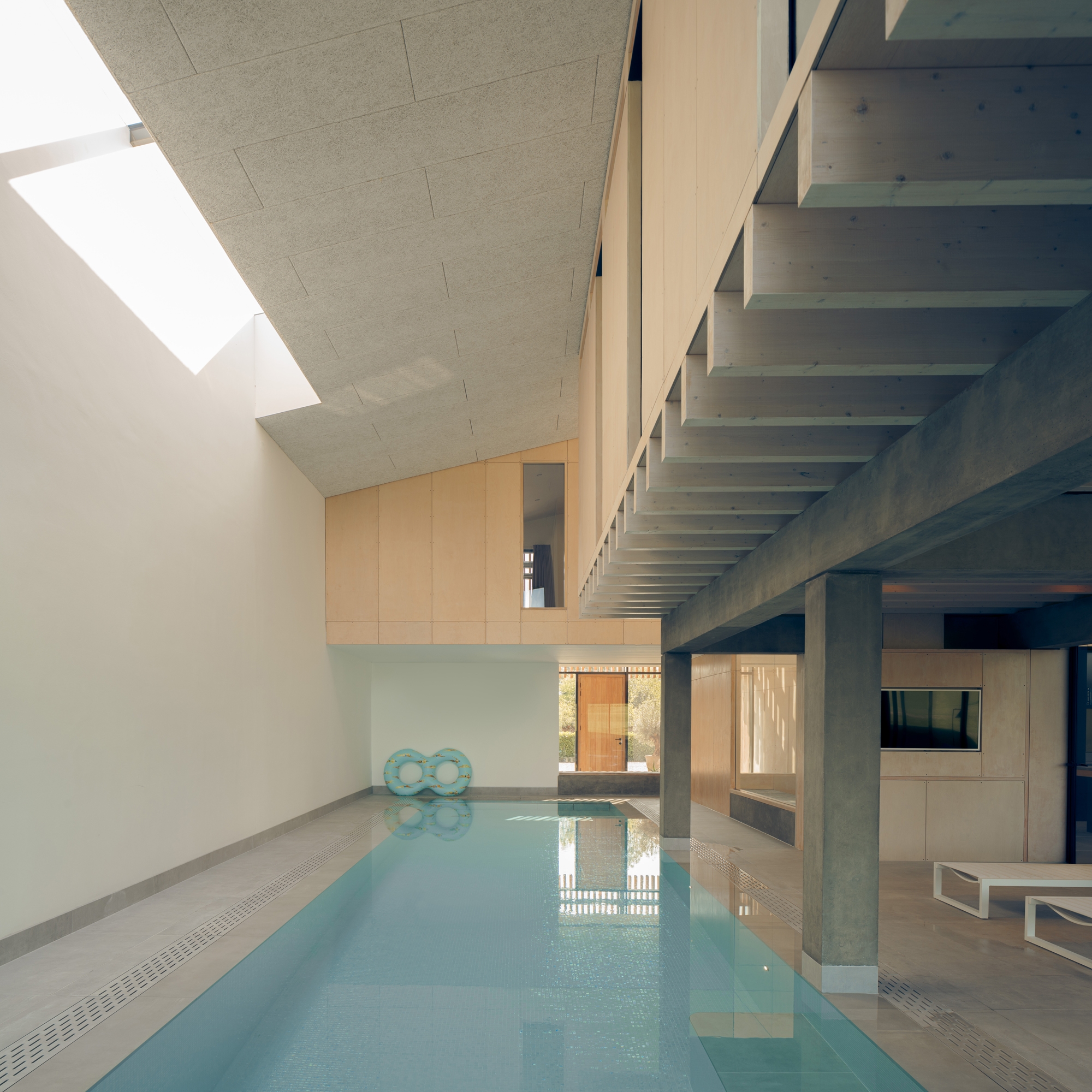 Internally, Luke and Klara were keen to preserve the raw and cavernous character of the original barn and avoid overtly domestic finishes. The interior is defined by pure architectural structures inspired by the direct and rudimentary language of agricultural plant and buildings. These structures frame two principal double-height spaces: the living, kitchen and dining space and indoor swimming pool and spa area. An in-situ concrete frame with articulated timber components places a dramatic new master suite aloft the pool. An adjacent timber-framed structure clad in veneered plywood runs the width of the barn, creating more intimately scaled spaces including, on the upper level, the boys’ bedrooms and a guest bedroom with a private enclosed terrace; and, on the ground floor level, a cosy den/TV room with a lowered ceiling.